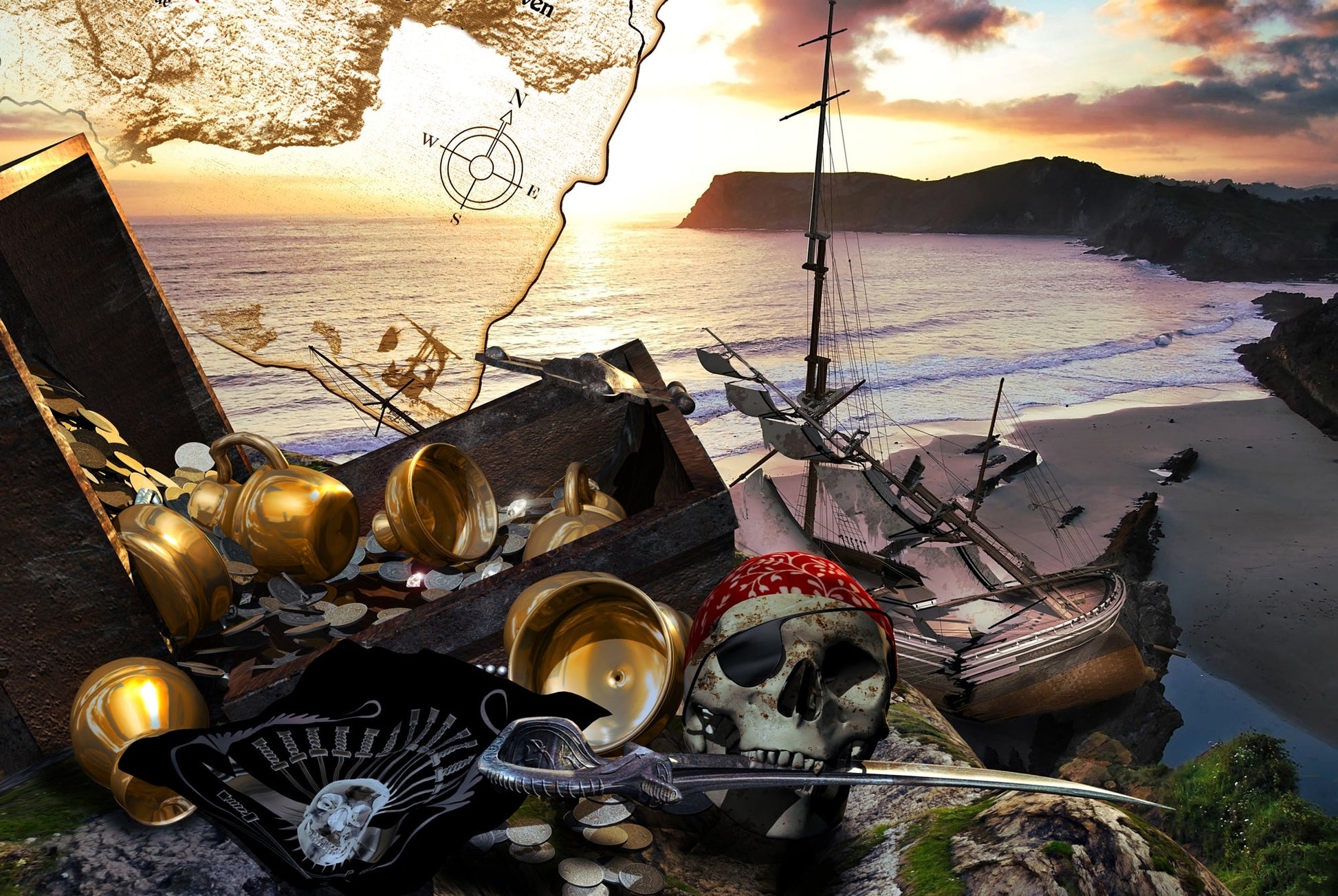 Photo Wall Mural-(3230J)-CORSAIR-NON WOVEN-Wallpaper-Pirates of Caribic Pirate Treasure Skull Map